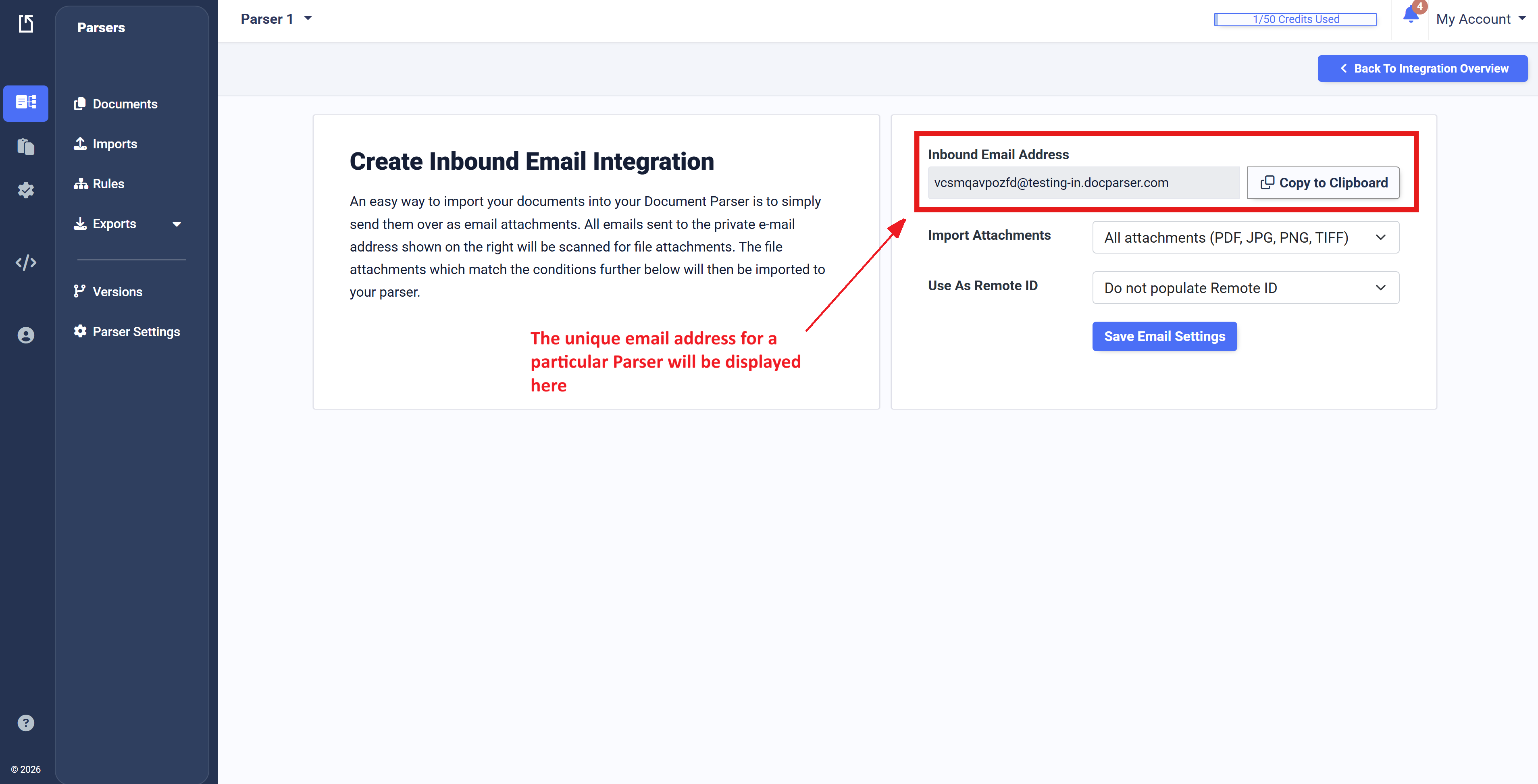 The secret email address can be accessed within the Parser you are working on under Imports → Custom Integrations → Inbound Email.