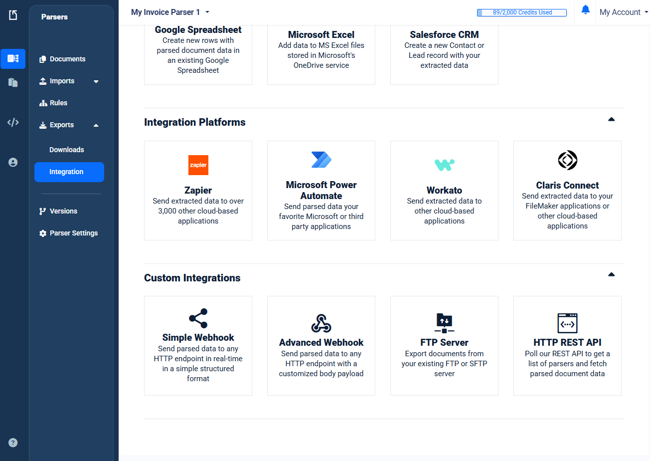 Whether you’re routing invoices to accounting software or pushing form data into your CRM, integrations make Docparser the connective tissue of your workflow.