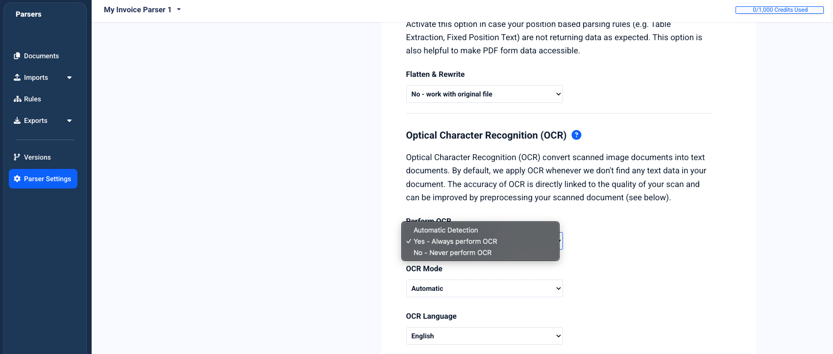 When this setting is enabled, Docparser converts your document into an image and then runs Optical Character Recognition (OCR) to recreate the text layer. This generates a clean text version of your PDF with proper character encoding. Once enabled, all newly uploaded documents will automatically be processed through OCR, and the text should appear correctly in your parsing rules.