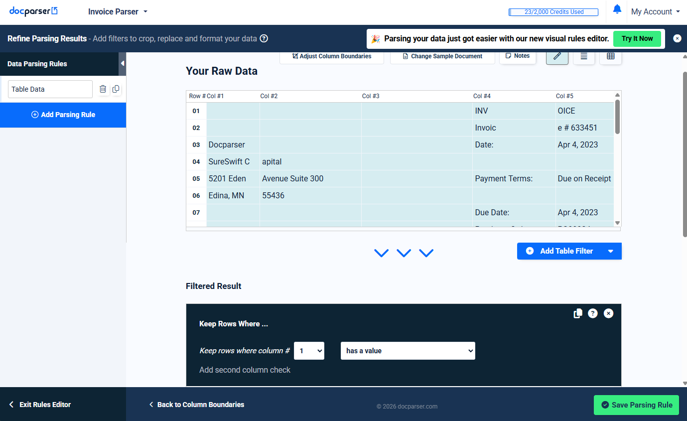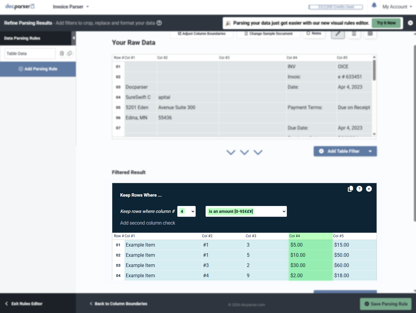 Your parsing rule will now extract only the rows that match this condition. You now have a parsing rule that can search your document for this data each time and only return the data you need!