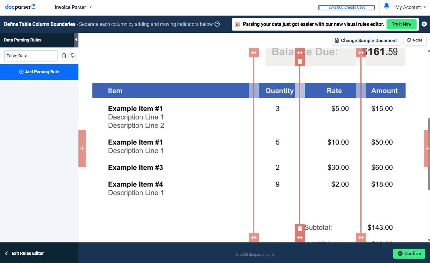 You can extract tables from documents by creating a "Table Data" or "Line Items" parsing rule. The short video below gives a quick overview, and a detailed step-by-step guide follows further down the page.