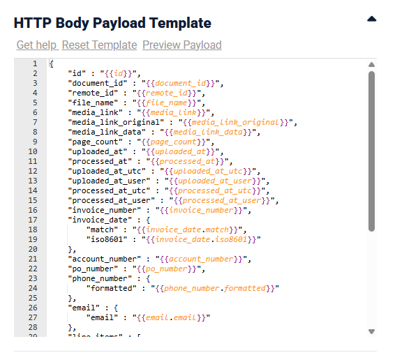 {{#each TableName}} … {{/each}}.Click Preview Payload to view an example using your most recent parsed document.