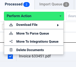 This can be done when saving a parsing rule by selecting "Prepare for Export" when saving a parsing rule, or by selecting the Documents on the Documents tab and choosing Perform Action > Move to Parse Queue
