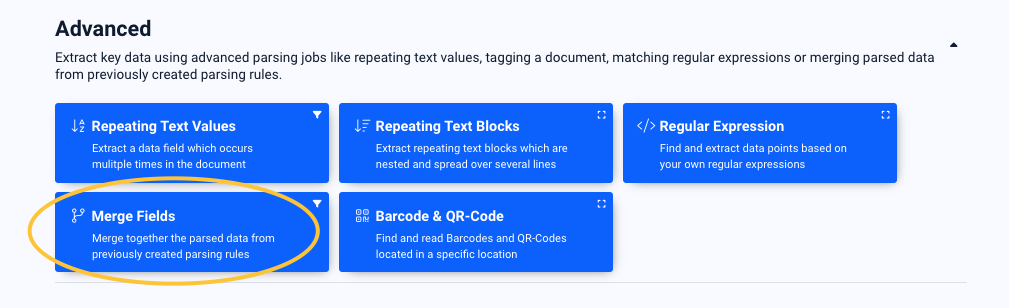Click on “Add Parsing Rule” to create a new parsing rule. Under the Advanced section choose the “Merge Fields” option from the available rule types.