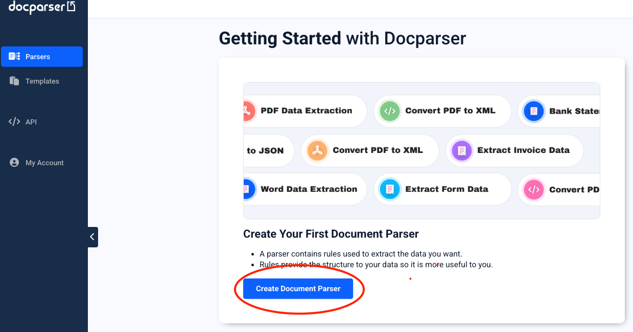 From the dashboard, click “Create Document Parser”.
