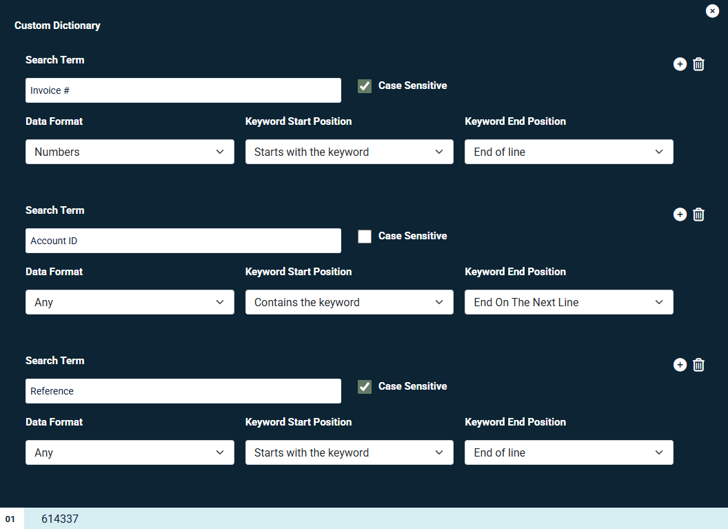 The Custom Dictionary allows you to define your own keywords and extraction patterns so Docparser can automatically detect and extract specific values from your documents. This is useful when your documents contain consistent labels such as “Invoice”, “Order Number”, “Account ID”, “Reference”, or any other term your business relies on.